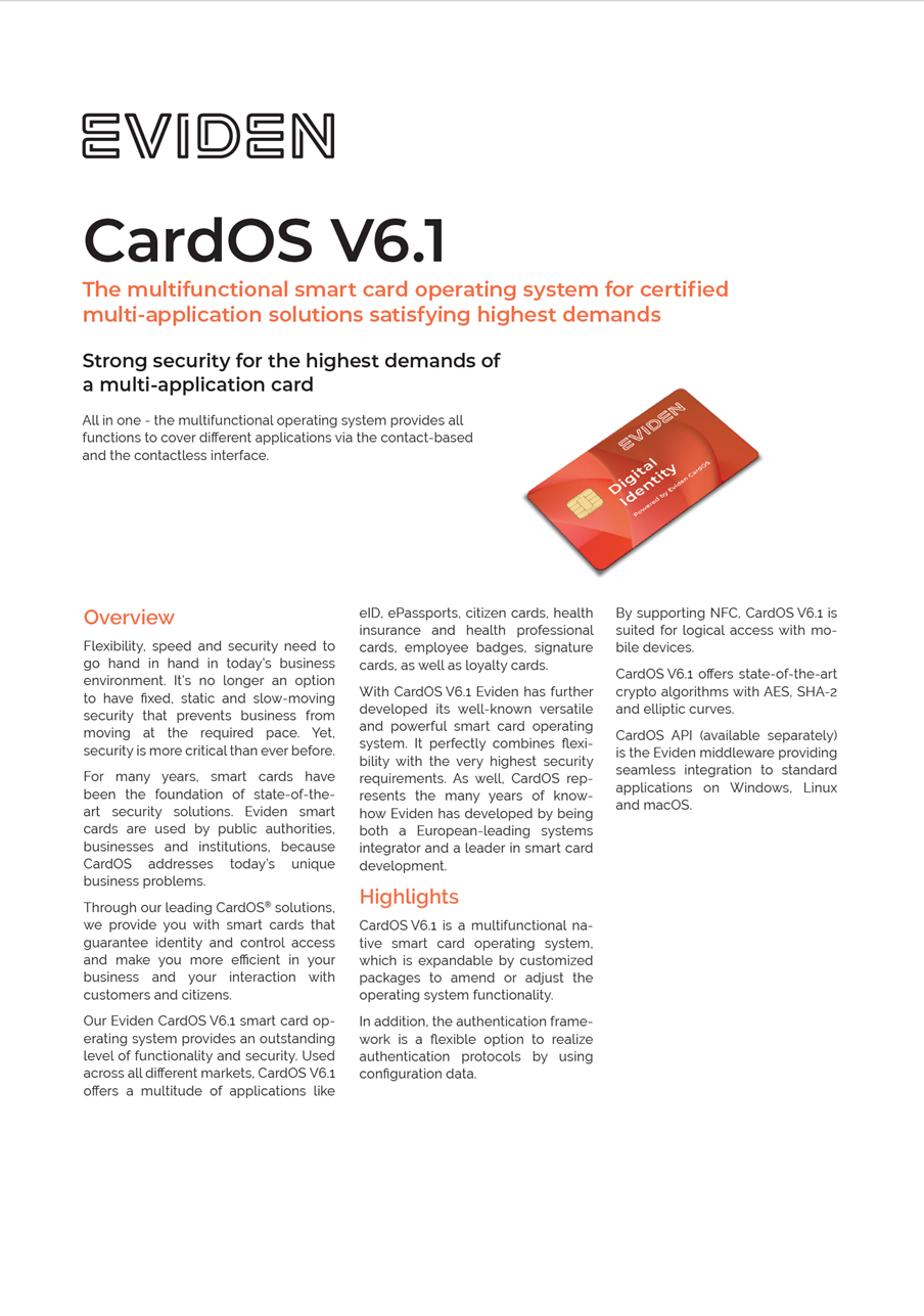 Das native Chipkarten-Betriebssystem CardOS bietet ein herausragendes Maß an Funktionalität und Sicherheit und eine Vielzahl von Anwendungen wie z.B. eID, elektronische Reisepässe und Bürgerkarten, Krankenkassen- und Heilberufsausweise, Mitarbeiterausweise, Signaturkarten sowie Kundenkarten.